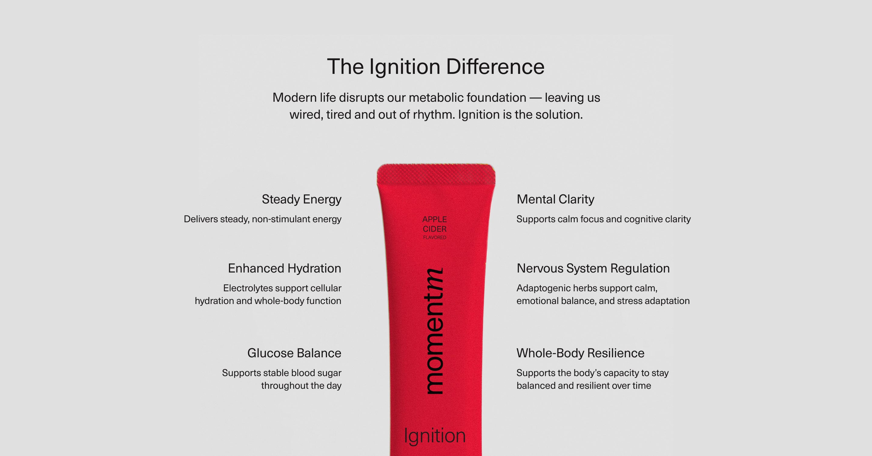 Ignition is different. It supports energy regulation at the systemic level, helping the body create steadier energy, maintain clarity, and adapt to stress without stimulants, caffeine or short-term fixes.